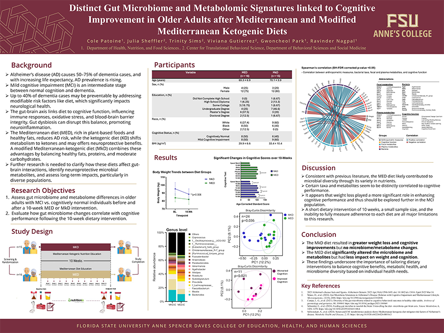 Cole is a second-year Ph.D. candidate focusing on gut microbiology and the gut microbiome. His research examines how specific dietary components from Mediterranean and Mediterranean-Ketogenic diets influence gut health and overall well-being. He collaborates with Dr. Julia Sheffler to study the impact of diet on cognition in older adults with mild cognitive impairment.