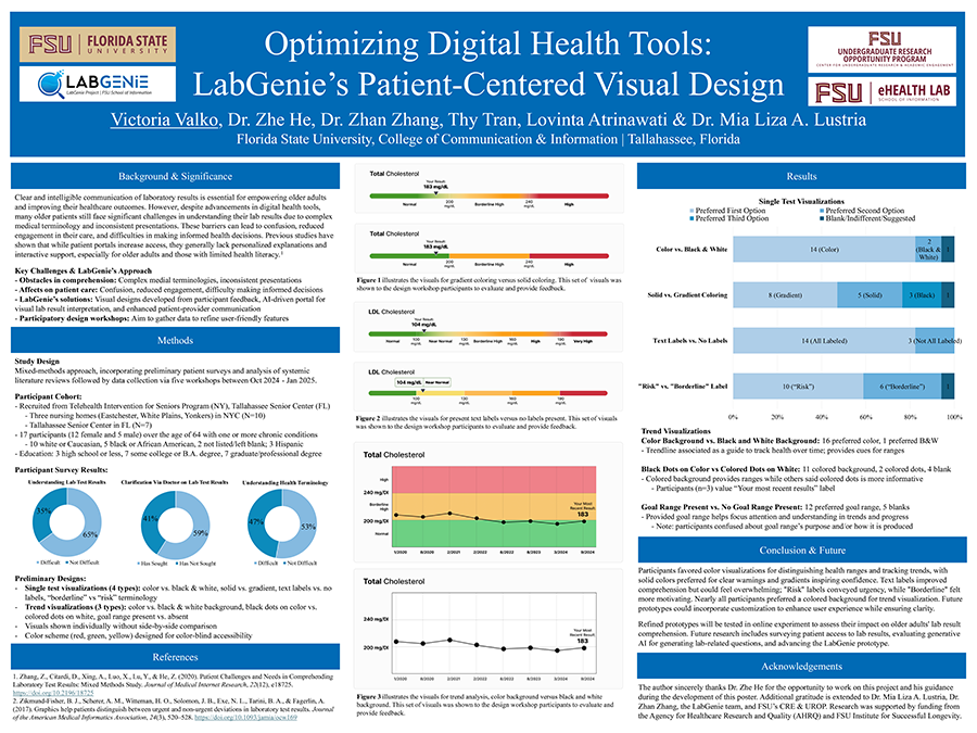 She is grateful for the opportunity to have worked on the LabGenie project with Dr. Zhe He via the Undergraduate Research Opportunity Program. Valko’s research focuses on improving how adults understand their lab test results. This is crucial for making health information more accessible through technology.