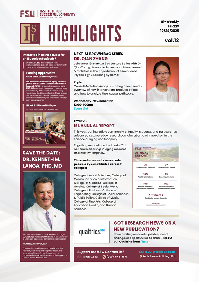 In this issue, we’re excited to share updates on the upcoming Brown Bag Lecture featuring Dr. Qian Zhang on Causal Mediation Analysis (November 5), a save-the-date for ISL Distinguished Speaker Dr. Kenneth M. Langa (January 29, 2026), highlights from the FY2025 ISL Annual Report showcasing ISL’s research impact across 11 FSU colleges, ISL’s participation in the FSU Health Expo, new opportunities to be featured on the ISL Podcast, and much more!