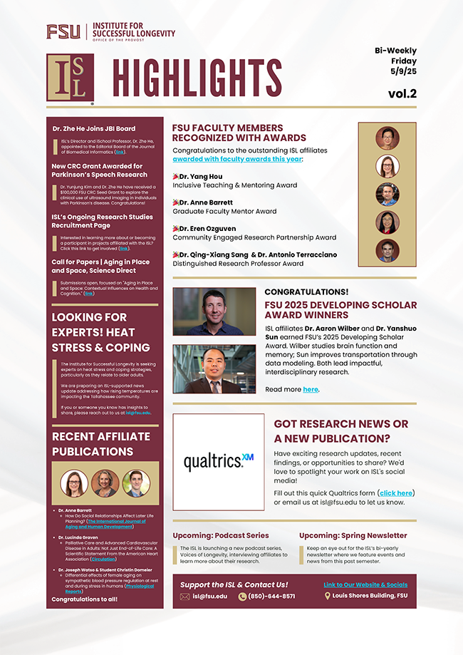 This May 2025 issue brings you new research highlights, recent updates, and insights into ongoing activities at the Institute for Successful Longevity (ISL). These bi-weekly newsletters are part of our social media initiative to keep you informed and engaged with our work.