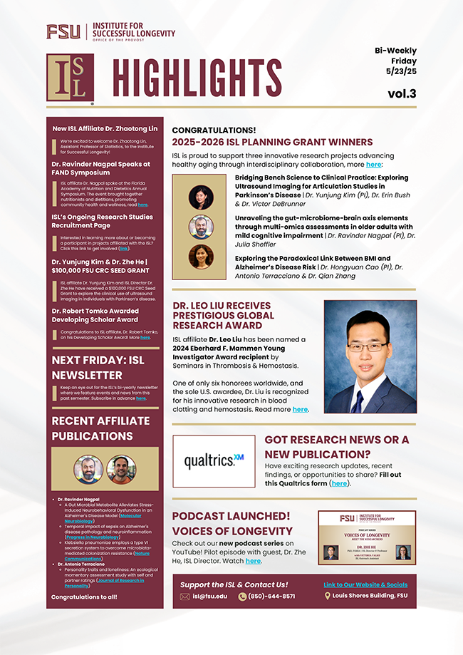 In this issue, we’re excited to announce the 2025–2026 ISL Planning Grant winners, introduce a new ISL Affiliate, spotlight several major awards and recognitions received by ISL faculty, highlight recent conference activity, share newly published research, and celebrate the launch of our very own podcast: Voices of Longevity.