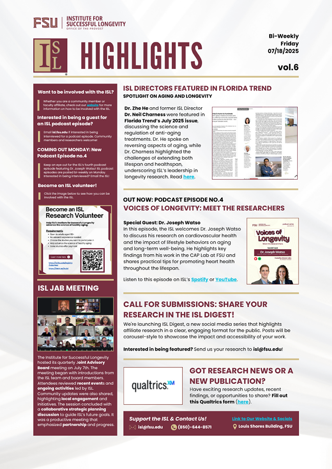 In this issue, we’re excited to share that ISL directors were recently featured in Florida Trend, along with a brand-new episode of the Voices of Longevity podcast, a call for submissions for ISL Digest, which is our new social media series, and much more.